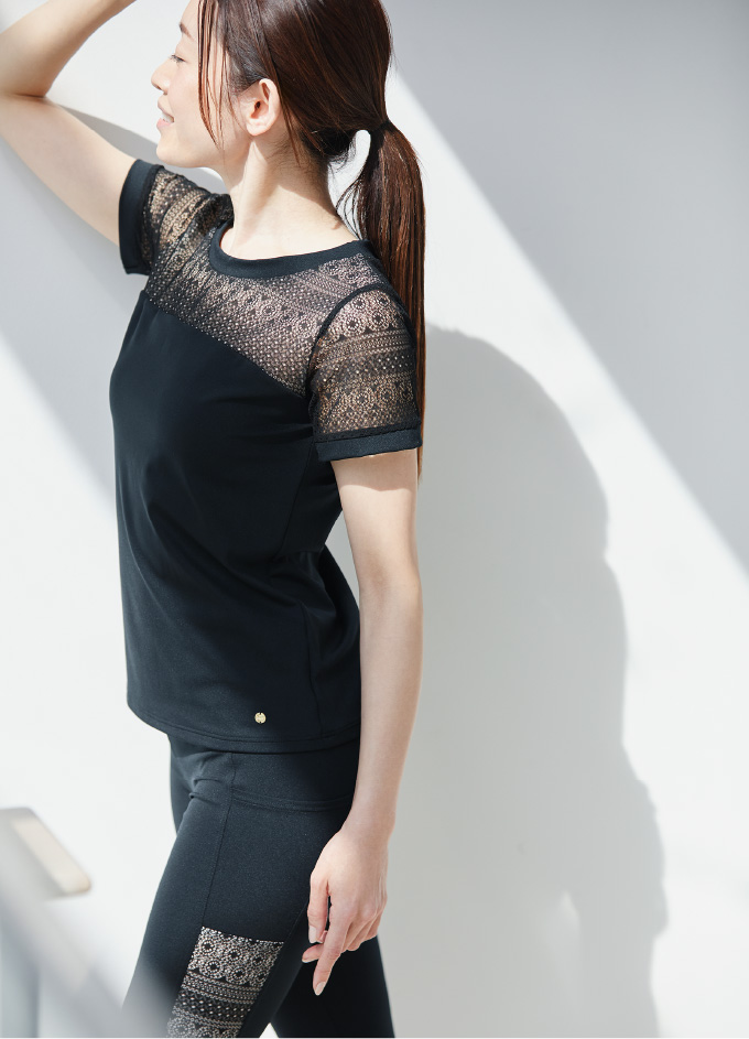 私の場合、地味になりがちなブラックは避けていましたが、これは胸元から袖にかけてレースをあしらったデザインで華やか。レギンスもサイドのレースで脚長に。ピラティスは鏡に映る自分と向き合うことも多いので、自分がきれいに映るウェア選びも大切。私自身もより理想の身体に近づけるよう、日々向き合っていきたいです。