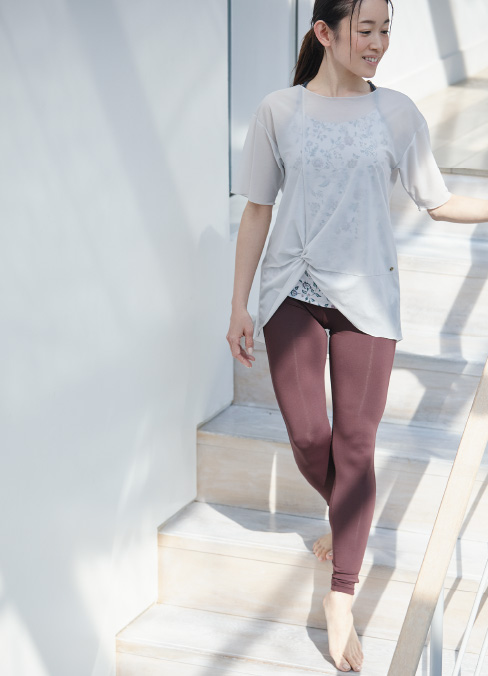 セピア色などニュアンスカラーも、どこか上品。吸水性が高いので、汗をかいてもすぐに乾き汗冷えの心配も無用です。ウェアひとつとっても、こだわって選びたい。自分自身の高揚感、生徒さんに与える印象、そして自分に身体の声にも耳を傾けて。自分が心地のよい状態であるための選択こそていねいに。その積み重ねが大事だと思っています。