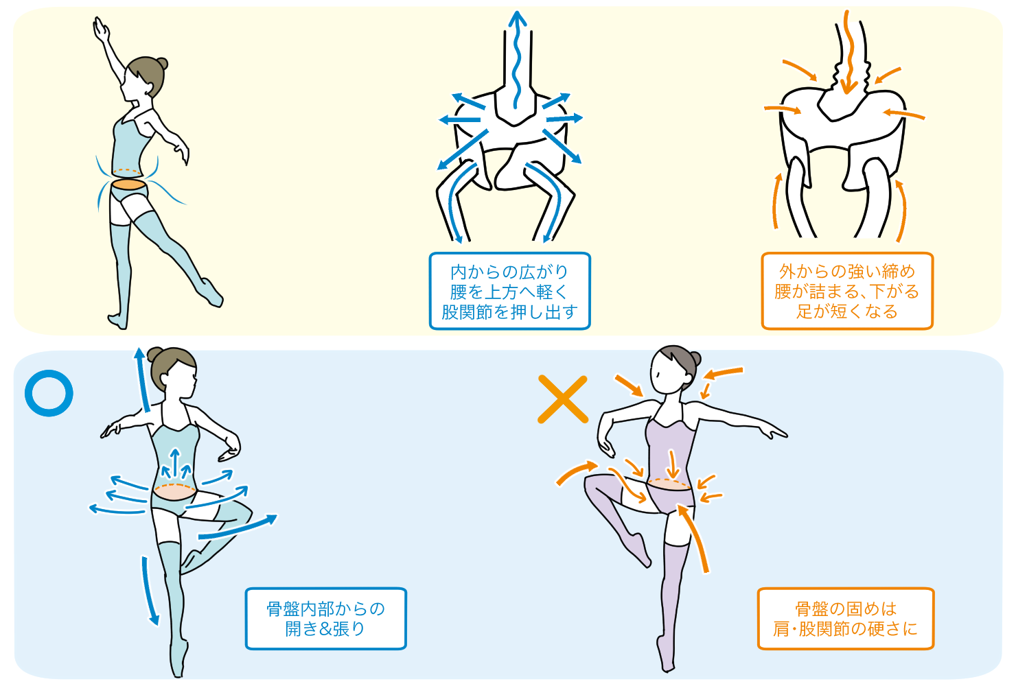 ポールドブラなど、上体が動きを出すときに、その土台「受け皿」となるのは骨盤。輪切リングをグッと締めて固めたり、極端に下がって落ちるようにしてしまうと、上体の動きが小さくなったり止まったりします。骨盤輪切リングは、骨を内から広げるように、上に光を放つように「引き上げましょう」。
