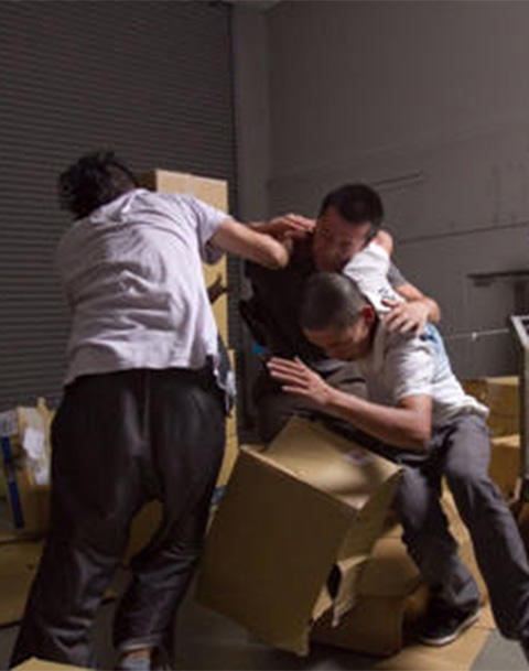 ワールドレポート/東京関口 紘一text by Koichi SekiguchiPeeping Tom " 32, rue Vandenbranden "ピーピング・トム『ヴァンデンブランデン通り32番地』ピーピング・トムの『ヴァンデンブランデン通り32番地』は雪の中。下手に一部屋、上手に二部屋が通りに面して建っている。いくつものトランクをもって、恐らくは長い旅の果てに流れ着いた人たちがいる。ここ