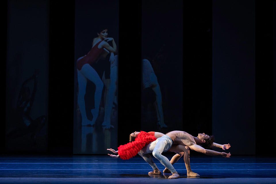 後方スクリーンにオーストラリア・バレエ団の歴史を彩ってきたダンサーたちが次々と映し出された。ヒューストン・バレエの芸術監督スタントン・ウェルチの両親、ガーシュ・ウェルチとマリリン・ジョーンズ(第4代目芸術監督)のカップルの写真に、スタントン・ウェルチ振付の『マダム・バタフライ』と『シルヴィア』の映像が流れた。『パラゴン』の制作にはバレエ団の50万枚のアーカイブから285点のプロジェクションが使用された。