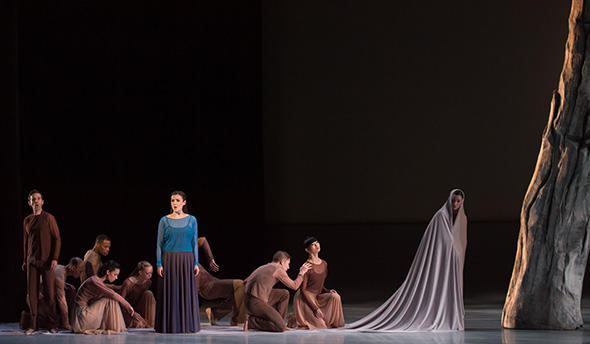 ポーズを置いて幕が開くと、紗幕の向こうに天井から斜めに薄く光がさすように見えた。音楽とともに照明が明るくなると、光と思えたのは実は巨大な木のセットであった。そしてその木の根元に頭からすっぽりと布を被った女性が立っている。聖母マリアだ。左からダンサーたちが入ってくるが、そのうち二人は同様の衣裳を着たシンガー(Andriana Chuchman/ソプラノ、Anthony Roth Costanzo/カウンターテナー)だ。二人が美しい声で歌い出すと、ダンサーたちが踊りだした。歌詞はラテン語であるため、舞台の上に設置されたデジタルボードに歌詞の英訳が映し出される。我が子イエスを失った母マリアの悲哀を込めた歌だ。大きな布が上から降りてきて、女性ダンサーたちが頭から被ると、古代イスラエルの女性たちを連想させる。そしてもう一本、舞台を横切るほどの大きな木のセットが上から降りてきて、既に斜めに降りている木とクロスすると、巨大な十字架を示唆した。イエスと思われる男性が木に取りすがるようにすると、女性たちが命乞いをするような、何かを求めるように踊り、シンガーも同様の振りを交えながら歌う。非常に音楽に重きを置いた制作で、歌の内容を克明に描いて悲しみと忍耐を表現している。ダンサーたちは感情をこめて踊っている。強いバレエテクニックに基づいたモダンダンスで、グラハムに似たドラマ性を持っている。