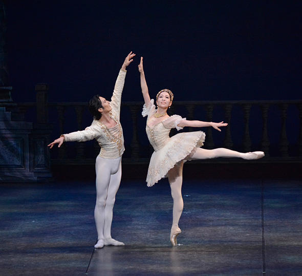 3幕冒頭は地球儀を前に王子は友人たちとあれこれ思案している。そして友人たち(吉田旭、武藤天華)と旅に出る。背景はいたってシンプルで王子、王子の友人たちがスペイン、エチオピア、インドへ出かける。『ロミオとジュリエット』のモンタギュー・トリオ(ロミオ、マキューシオ、ベンヴォーリオ)のような組み合わせ。せっかくの男性ダンサーの見せ場なので、ただ走る、という演技をもう少し減らしてたっぷり踊ってほしかった気もするが、各国のエキゾチックな踊りはガラっと雰囲気を変え、ピリリと辛いスパイスのように効いて舞台がひきしまる。