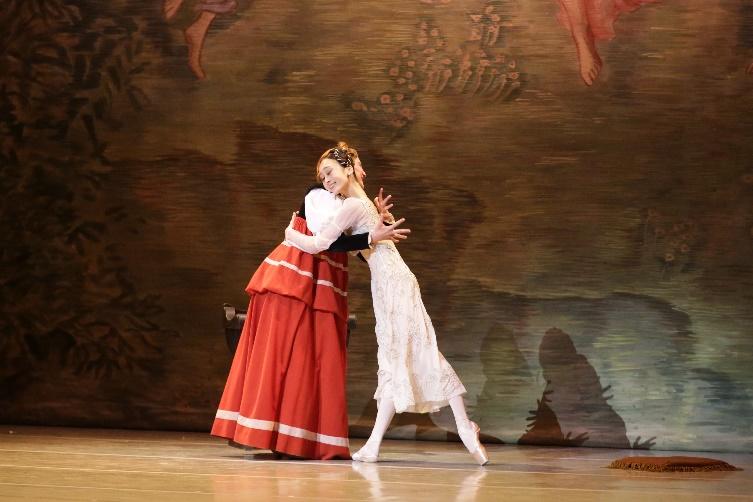 一幕はヴェローナの広場で恋に恋するロミオの登場から始まり、キャピュレット家に舞台が移ると、乳母にクッションを放り投げ、追いかけられながら戯れる愛らしいジュリエットの登場が続く。永久のジュリエットはどこまでも軽く、その精密なポワントワークのためか、鋭敏さも感じる。仮面舞踏会の場面では、伏し目がちに、はにかんだような笑顔を浮かべ、可憐なお嬢さまといった印象。回転のバランスも長く、着地までも非常に丁寧で、技術的にも申し分ない出来だった。見どころであるキャピュレット家の舞踏会では、クッションを片手に持つ男性がかかとを床にうちつけ、エスコートされる女性たちが上体を後ろに反らせ長い衣をゆったりと引きずりながら踊り、家来たちがその膝にクッションをあてがう。この宮廷舞踊を想起させるキャピュレット家の踊りは圧巻の迫力だった。一方、若きロミオとジュリエットの出会いは清らかで切ない。スチョーピンのロミオは感情表現が細やかな上品な青年で、正確で洗練されたテクニックと相まって見事である。繊細な永久とのパートナーシップも抜群だった。