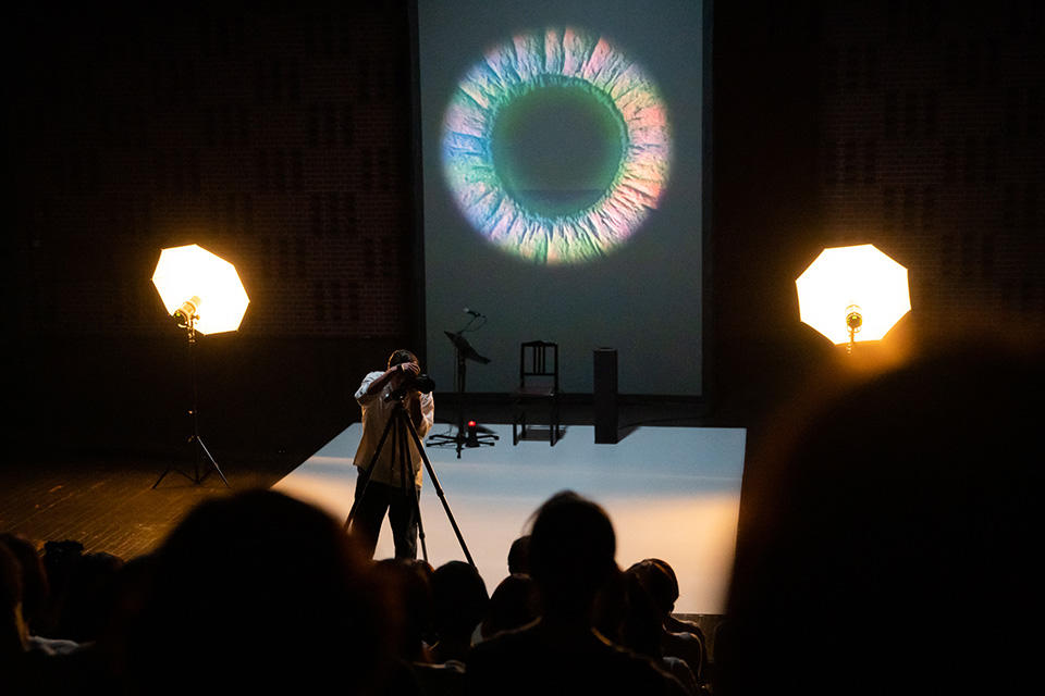 怖いのは、目が見えなくなって隔離された人々の中に、目が見えている者がいて、彼らを観察していること。舞台上にはカメラとストロボが設置され、森山が客席にカメラを向けるシーンもある。見る側と見られる側が逆転し、ふと一方的に「見られる」恐怖を感じた。