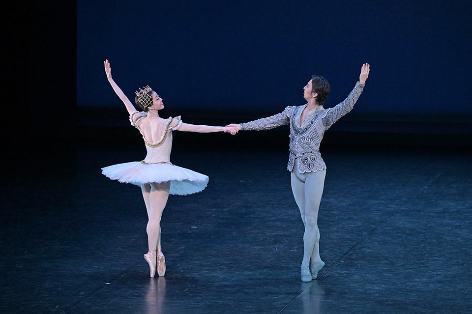 続いて『ライモンダ』は夢の場のパ・ド・ドゥ。ジャン・ド・ブリエンヌ(石田亮一)がライモンダ(中川郁)をリフトして登場。大胆に大きくゆっくりとした動きで、夢幻の中に幸福感が自ずと浮かび上がってくる。『ライモンダ』と『ラ・バヤデール』は、牧阿佐美の古典バレエ改訂振付の傑作だろう。
