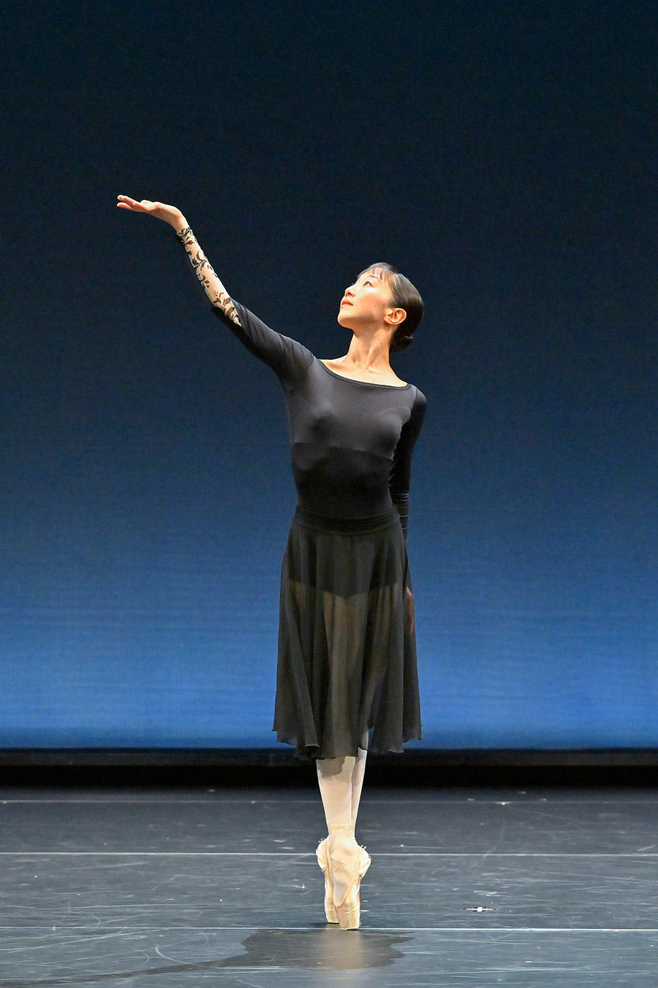 期待と不安の間でゆらめくような、優雅な動き。斜め上方を仰ぎ、手のひらに光を受けるようなポーズが印象的だ。黒鳥のようにゴージャスな悪女でもなく、マノンのように無邪気でもない、容易ならぬ雰囲気である。トウで立った姿勢から反り返りつつ回転する、危うくも美しい動きが目に焼きつく。