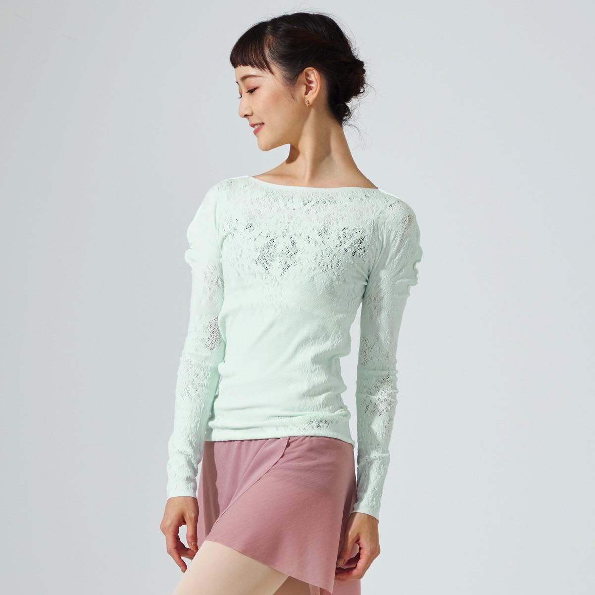 デコルテが美しく見えるバレリーナネックの長袖トップ。